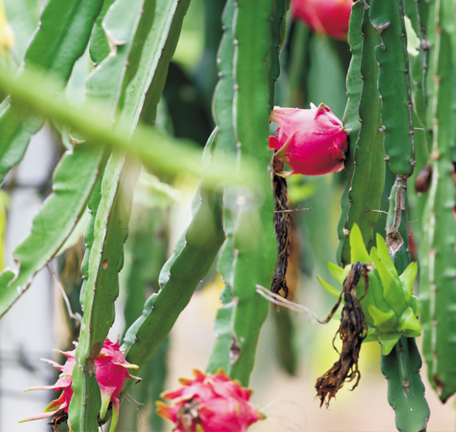 火龙果又称红龙果、龙珠果、仙蜜果,仙人掌科,呈椭圆形,自然状态下,果实于夏秋成熟,味甜,多汁。为热带、亚热带水果,喜光耐阴、耐热耐旱、喜肥耐瘠。不使用任何农药可以正常生长。因此,火龙果是一种绿色、环保果品和具有必定疗效的保健养分食品。