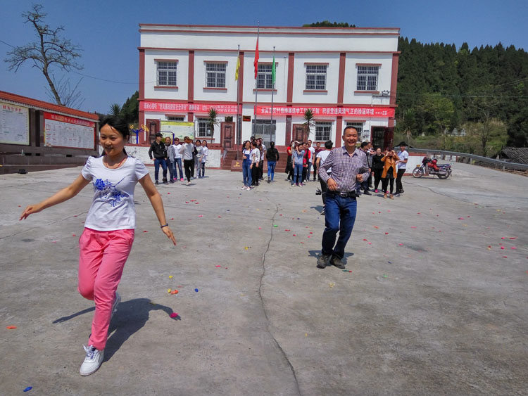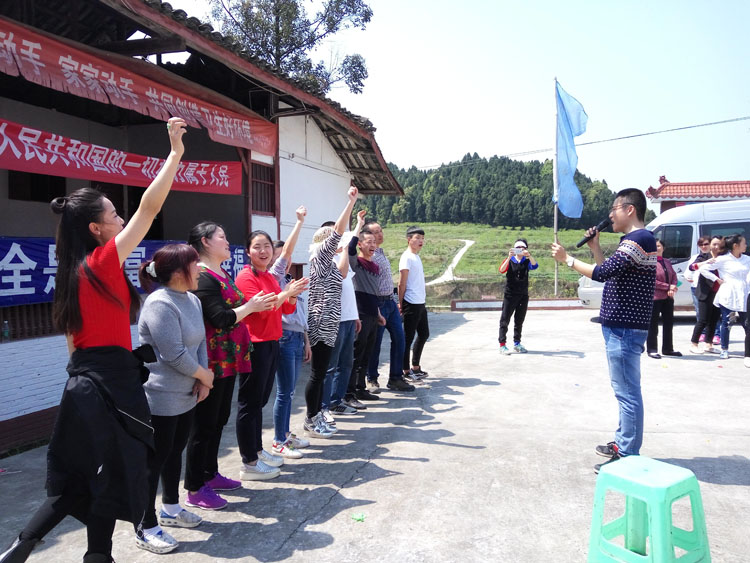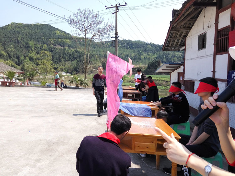 四月的中岭,桃花正漫漫凋谢,我们的培训地点选在了中岭乡上坊寺村的村委会坪坝里, 这里地势较高,远处的大棚尽在眼前。伴随着动感的音乐节奏,来自于集团公司总部、酒店、基地的员工选手先后完成了踩气球、破冰游戏、战地营救、珠行万里等培训项目。