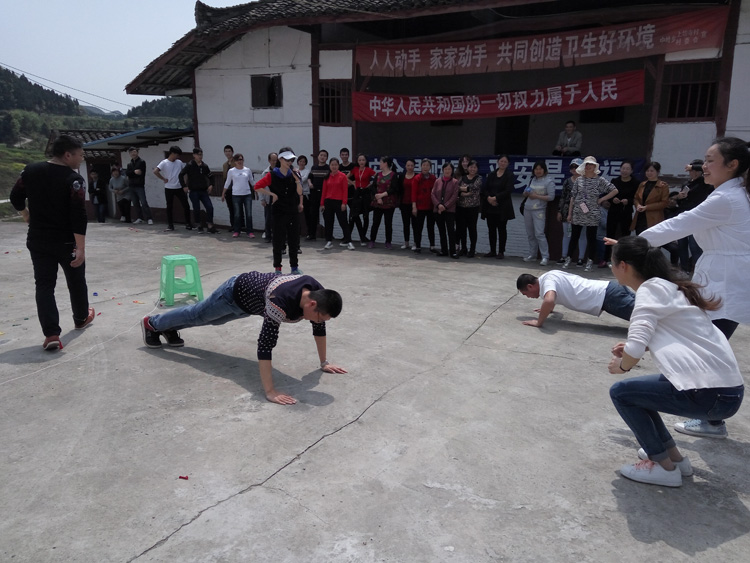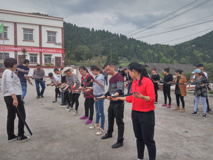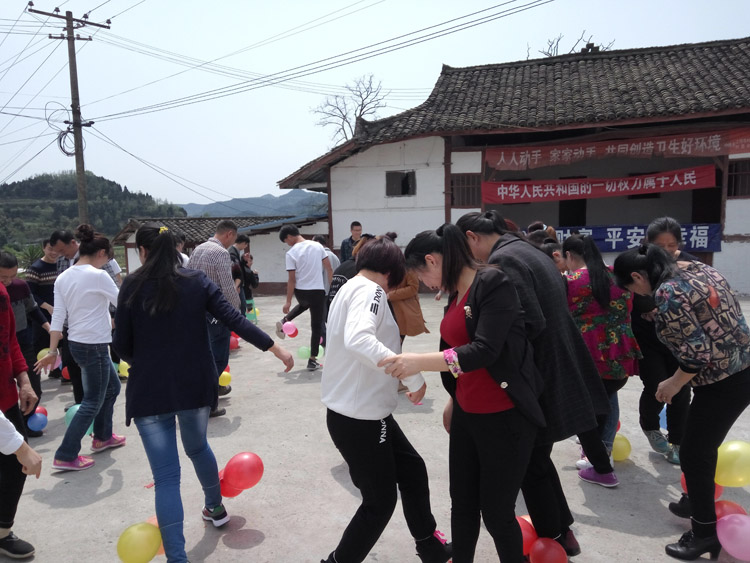 四月的中岭,桃花正漫漫凋谢,我们的培训地点选在了中岭乡上坊寺村的村委会坪坝里, 这里地势较高,远处的大棚尽在眼前。伴随着动感的音乐节奏,来自于集团公司总部、酒店、基地的员工选手先后完成了踩气球、破冰游戏、战地营救、珠行万里等培训项目。
